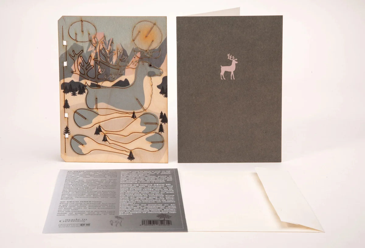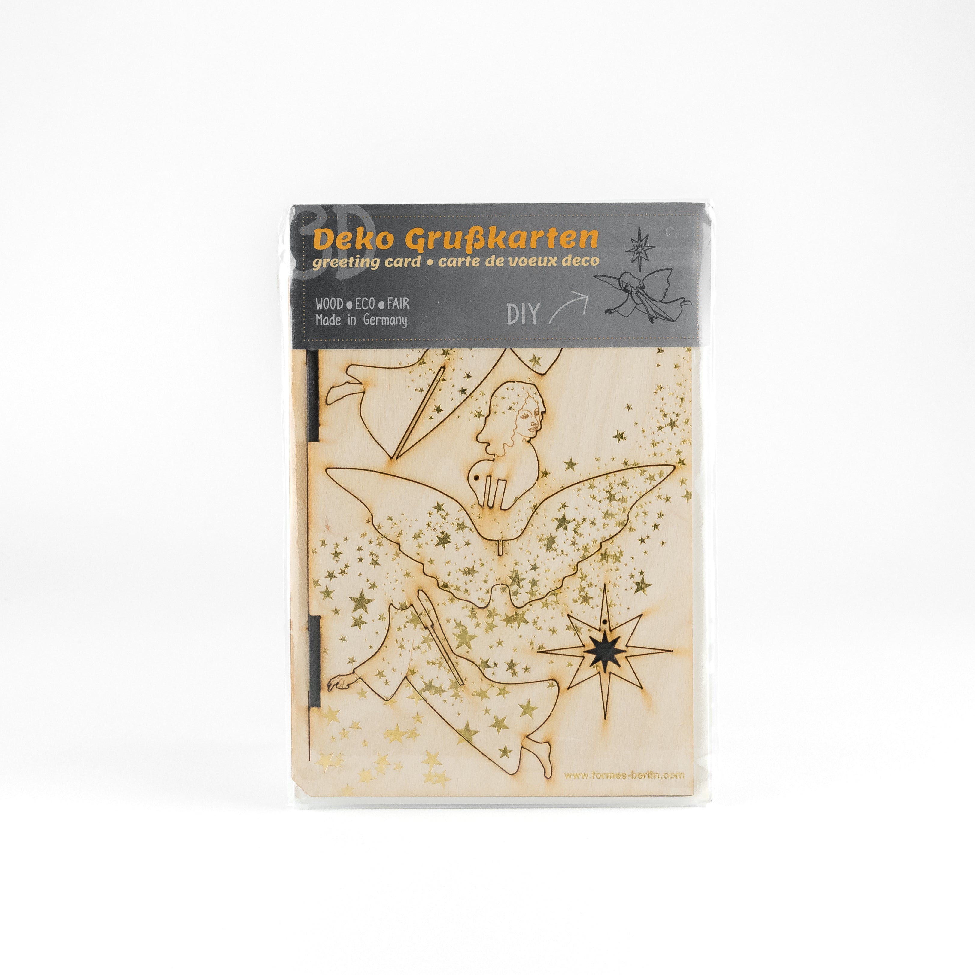 These Greetings cards double as a nifty art project for the recipient! They come complete with all the pieces to make a beautiful, wooden, hanging ornament; instructions in both English and German; and a color coordinated envelope to mail your special holiday card.